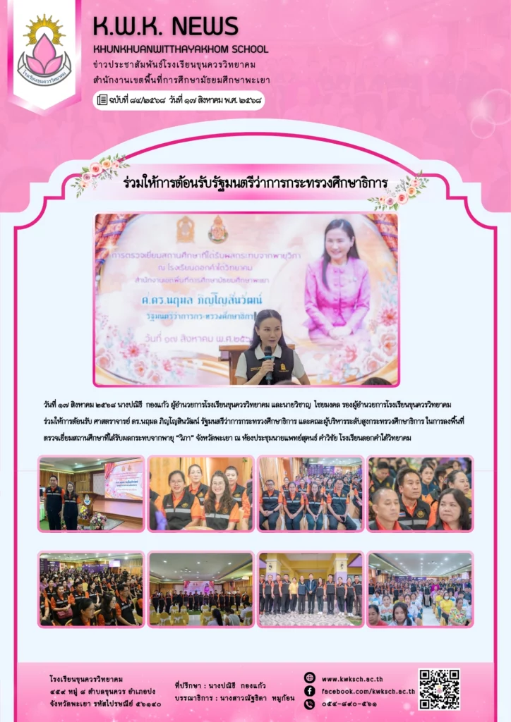 วันที่ ๑๗ สิงหาคม ๒๕๖๘ นางปณิธี กองแก้ว ผู้อำนวยการโรงเรียนขุนควรวิทยาคม และนายวิชาญ ไชยมงคล รองผู้อำนวยการโรงเรียนขุนควรวิทยาคม ร่วมให้การต้อนรับ ศาสตราจารย์ ดร.นฤมล ภิญโญสินวัฒน์ รัฐมนตรีว่าการกระทรวงศึกษาธิการ และคณะผู้บริหารระดับสูงกระทรวงศึกษาธิการ ในการลงพื้นที่ ตรวจเยี่ยมสถานศึกษาที่ได้รับผลกระทบจากพายุ “วิภา” จังหวัดพะเยา ณ ห้องประชุมนายแพทย์สุคนธ์ คำวิชัย โรงเรียนดอกคำใต้วิทยาคม