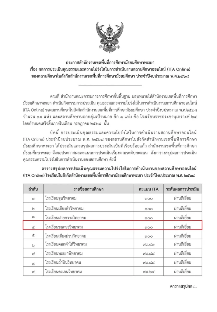 ผลการประเมินความโปร่งใส ในการดำเนินงานสถานศึกษาออนไลน์(ITA ONLINE) ของสถานศึกษาในสังกัดสำนักงานเขตพื้นที่ การศึกษามัธยมศึกษาพะเยา ปีงบประมาณ พ.ศ.2568