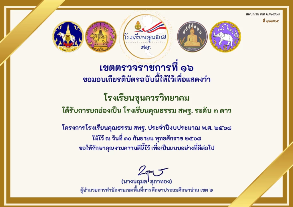 🎉🏅 โรงเรียนขุนควรวิทยาคม ได้รับเกียรติบัตรและการยกย่องเป็น “โรงเรียนคุณธรรม สพฐ. ระดับ ๓ ดาว”