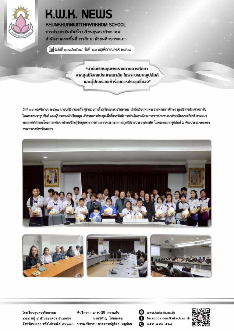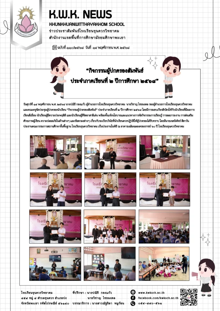 วันศุกร์ที่ ๑๔ พฤศจิกายน พ.ศ. ๒๕๖๘ นางปณิธี กองแก้ว ผู้อำนวยการโรงเรียนขุนควรวิทยาคม นายวิชาญ ไชยมงคล รองผู้อำนวยการโรงเรียนขุนควรวิทยาคม และคณะครูจัดประชุมผู้ปกครองนักเรียน “กิจกรรมผู้ปกครองสัมพันธ์” ประจำภาคเรียนที่ ๒ ปีการศึกษา ๒๕๖๘ โดยมีการมอบเกียรติบัตรให้กับนักเรียนที่มีผลการเรียนดีเยี่ยม นักเรียนผู้มีความประพฤติดี และนักเรียนผู้มีจิตอาสาดีเด่น พร้อมทั้งแจ้งนโยบายและแนวทางการจัดกิจกรรมการเรียนรู้ การลดภาระงาน การส่งเสริมศักยภาพ