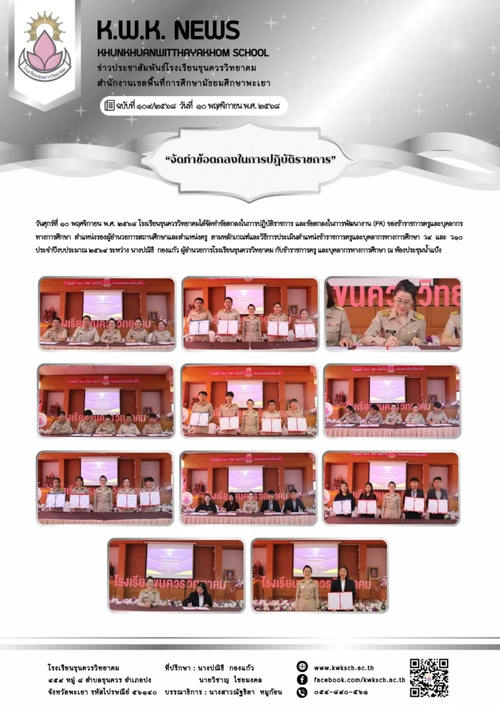 วันศุกร์ที่ ๑๐ พฤศจิกายน พ.ศ. ๒๕๖๘ โรงเรียนขุนควรวิทยาคมได้จัดทำข้อตกลงในการปฏิบัติราชการ และข้อตกลงในการพัฒนางาน (PA) ของข้าราชการครูและบุคลากรทางการศึกษา ตำแหน่งรองผู้อำนวยการสถานศึกษาและตำแหน่งครู ตามหลักเกณฑ์และวิธีการประเมินตำแหน่งข้าราชการครูและบุคลากรทางการศึกษา ว๙ และ ว๑๐ ประจำปีงบประมาณ ๒๕๖๙ ระหว่าง นางปณิธี กองแก้ว ผู้อำนวยการโรงเรียนขุนควรวิทยาคม กับข้าราชการครู และบุคลากรทางการศึกษา ณ ห้องประชุมน้ำแป้ง