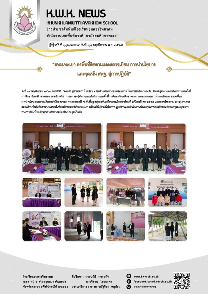 วันที่ ๑๙ พฤศจิกายน ๒๕๖๘ นางปณิธี กองแก้ว ผู้อำนวยการโรงเรียน พร้อมด้วยหัวหน้ากลุ่มบริหารงาน ให้การต้อนรับนายธงชัย จันแย้ ผู้อำนวยการสำนักงานเขตพื้นที่การศึกษามัธยมศึกษาพะเยา นายจักรพันธ์ ภาชนะ รองผู้อำนวยการสำนักงานเขตพื้นที่การศึกษามัธยมศึกษาพะเยา และคณะกรรมการในการติดตาม ตรวจเยี่ยม การนำนโยบายและจุดเน้นของสำนักงานคณะกรรมการการศึกษาขั้นพื้นฐานสู่การขับเคลื่อนการเปิดภาคเรียนที่ ๒ ปีการศึกษา ๒๕๖๘ และการบริหารงาน ๔ กลุ่มงานของสถานศึกษาในสังกัดสำนักงานเขตพื้นที่การศึกษามัธยมศึกษาพะเยา พร้อมทั้งให้กำลังใจในการปฏิบัติงานและดำเนินงานพัฒนาคุณภาพการศึกษาแก่คณะครูและบุคลากรทางการศึกษาโรงเรียนขุนควรวิทยาคม ณ ห้องประชุมน้ำแป้ง