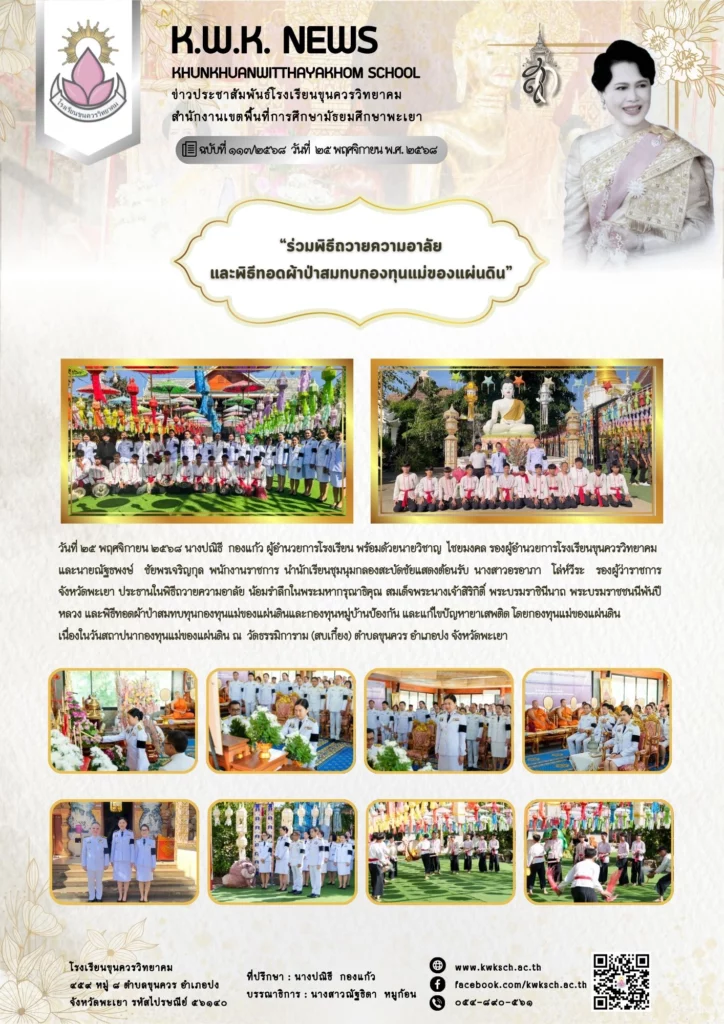 วันที่ ๒๕ พฤศจิกายน ๒๕๖๘ นางปณิธี กองแก้ว ผู้อำนวยการโรงเรียน พร้อมด้วยนายวิชาญ ไชยมงคล รองผู้อำนวยการโรงเรียนขุนควรวิทยาคม และนายณัฐธพงษ์ ชัยพรเจริญกุล พนักงานราชการ นำนักเรียนชุมนุมกลองสะบัดชัยแสดงต้อนรับ นางสาวอรอาภา โล่ห์วีระ รองผู้ว่าราชการจังหวัดพะเยา ประธานในพิธีถวายความอาลัย น้อมรำลึกในพระมหากรุณาธิคุณ สมเด็จพระนางเจ้าสิริกิติ์ พระบรมราชินีนาถ พระบรมราชชนนีพันปีหลวง และพิธีทอดผ้าป่าสมทบทุนกองทุนแม่ของแผ่นดินและกองทุนหมู่บ้านป้องกัน และแก้ไขปัญหายาเสพติด โดยกองทุนแม่ของแผ่นดิน เนื่องในวันสถาปนากองทุนแม่ของแผ่นดิน ณ วัดธรรมิการาม (สบเกี๋ยง) ตำบลขุนควร อำเภอปง จังหวัดพะเยา