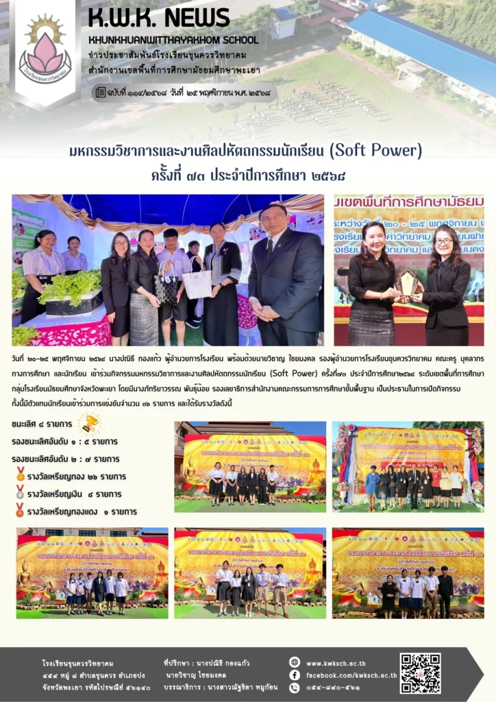 วันที่ ๒๐-๒๕ พฤศจิกายน ๒๕๖๘ นางปณิธี กองแก้ว ผู้อำนวยการโรงเรียน พร้อมด้วยนายวิชาญ ไชยมงคล รองผู้อำนวยการโรงเรียนขุนควรวิทยาคม คณะครู บุคลากรทางการศึกษา และนักเรียน เข้าร่วมกิจกรรมมหกรรมวิชาการและงานศิลปหัตถกรรมนักเรียน (Soft Power) ครั้งที่๗๓ ประจำปีการศึกษา๒๕๖๘ ระดับเขตพื้นที่การศึกษา กลุ่มโรงเรียนมัธยมศึกษาจังหวัดพะเยา โดยมีนางภัทริยาวรรณ พันธ์ุน้อย รองเลขาธิการสำนักงานคณะกรรมการการศึกษาขั้นพื้นฐาน เป็นประธานในการเปิดกิจกรรม ทั้งนี้มีตัวแทนนักเรียนเข้าร่วมการแข่งขันจำนวน ๓๖ รายการ และได้รับรางวัลดังนี้