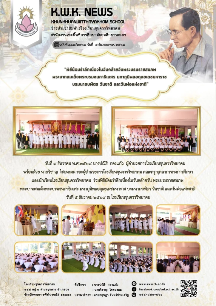 วันที่ ๔ ธันวาคม พ.ศ.๒๕๖๘ นางปณิธี กองแก้ว ผู้อำนวยการโรงเรียนขุนควรวิทยาคม พร้อมด้วย นายวิชาญ ไชยมงคล รองผู้อำนวยการโรงเรียนขุนควรวิทยาคม คณะครู บุคลากรทางการศึกษา และนักเรียนโรงเรียนขุนควรวิทยาคม ร่วมพิธีน้อมรำลึกเนื่องในวันคล้ายวัน พระบรมราชสมภพ พระบาทสมเด็จพระบรมชนกาธิเบศร มหาภูมิพลอดุลยเดชมหาราช บรมนาถบพิตร วันชาติ และวันพ่อแห่งชาติ วันที่ ๕ ธันวาคม ๒๕๖๘ ณ โรงเรียนขุนควรวิทยาคม
