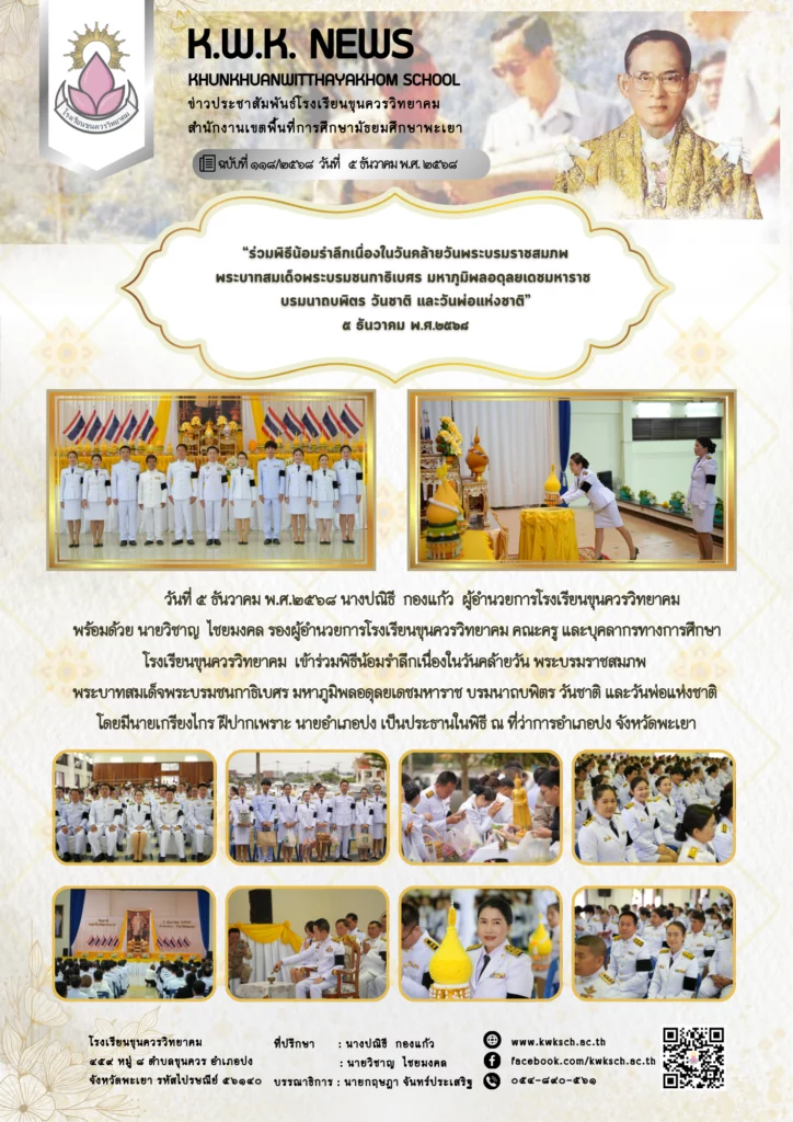 วันที่ ๕ ธันวาคม พ.ศ.๒๕๖๘ นางปณิธี กองแก้ว ผู้อำนวยการโรงเรียนขุนควรวิทยาคม พร้อมด้วย นายวิชาญ ไชยมงคล รองผู้อำนวยการโรงเรียนขุนควรวิทยาคม คณะครู และบุคลากรทางการศึกษา โรงเรียนขุนควรวิทยาคม เข้าร่วมพิธีน้อมรำลึกเนื่องในวันคล้ายวัน พระบรมราชสมภพ พระบาทสมเด็จพระบรมชนกาธิเบศร มหาภูมิพลอดุลยเดชมหาราช บรมนาถบพิตร วันชาติ และวันพ่อแห่งชาติ โดยมีนายเกรียงไกร ฝีปากเพราะ นายอำเภอปง เป็นประธานในพิธี ณ ที่ว่าการอำเภอปง จังหวัดพะเยา