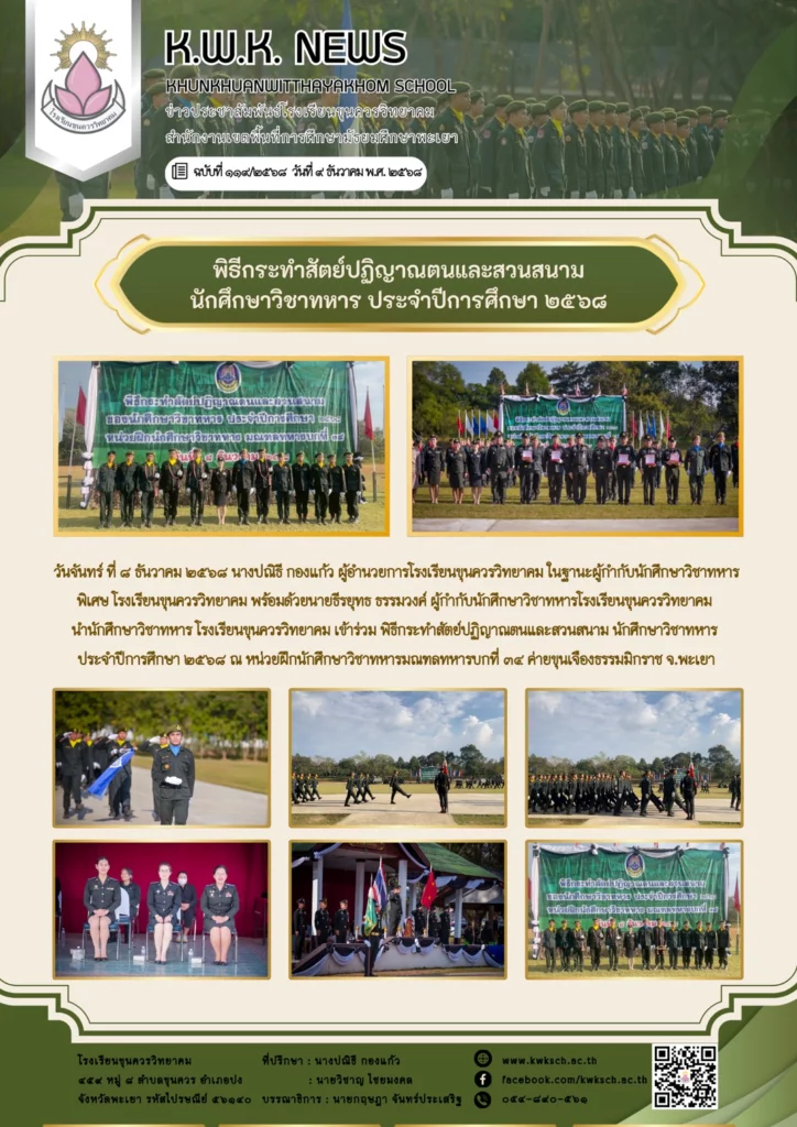 วันจันทร์ ที่ ๘ ธันวาคม ๒๕๖๘ นางปณิธี กองแก้ว ผู้อำนวยการโรงเรียนขุนควรวิทยาคม ในฐานะผู้กำกับนักศึกษาวิชาทหารพิเศษ โรงเรียนขุนควรวิทยาคม พร้อมด้วยนายธีรยุทธ ธรรมวงค์ ผู้กำกับนักศึกษาวิชาทหารโรงเรียนขุนควรวิทยาคม นำนักศึกษาวิชาทหาร โรงเรียนขุนควรวิทยาคม เข้าร่วม พิธีกระทำสัตย์ปฏิญาณตนและสวนสนาม นักศึกษาวิชาทหาร ประจำปีการศึกษา ๒๕๖๘ ณ หน่วยฝึกนักศึกษาวิชาทหารมณฑลทหารบกที่ ๓๔ ค่ายขุนเจืองธรรมมิกราช จังหวัดพะเยา