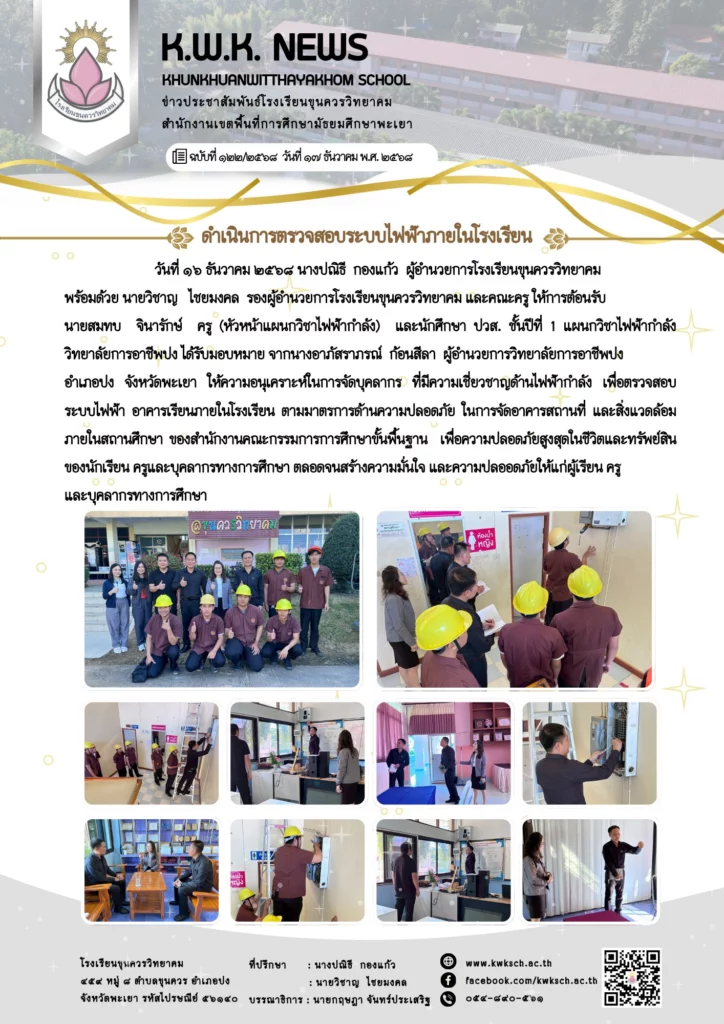 วันที่ ๑๖ ธันวาคม ๒๕๖๘ นางปณิธี กองแก้ว ผู้อำนวยการโรงเรียนขุนควรวิทยาคม พร้อมด้วย นายวิชาญ ไชยมงคล รองผู้อำนวยการโรงเรียนขุนควรวิทยาคม และคณะครู ให้การต้อนรับนายสมทบ จินารักษ์ ครู (หัวหน้าแผนกวิชาไฟฟ้ากำลัง) และนักศึกษา ปวส. ชั้นปีที่ 1 แผนกวิชาไฟฟ้ากำลัง วิทยาลัยการอาชีพปง ซึ่งได้รับมอบหมาย จากนางอาภัสราภรณ์ ก้อนสีลา ผู้อำนวยการวิทยาลัยการอาชีพปง อำเภอปง จังหวัดพะเยา ให้ความอนุเคราะห์ในการจัดบุคลากร ที่มีความเชี่ยวชาญด้านไฟฟ้ากำลัง เพื่อตรวจสอบระบบไฟฟ้า อาคารเรียนภายในโรงเรียน ตามมาตรการด้านความปลอดภัย ในการจัด อาคารสถานที่และสิ่งแวดล้อมภายในสถานศึกษา ของสำนักงานคณะกรรมการการศึกษาขั้นพื้นฐาน เพื่อความปลอดภัยสูงสุดในชีวิตและทรัพย์สินของนักเรียน ครูและบุคลากรทางการศึกษา ตลอดจนสร้างความมั่นใจ และความปลออดภัยให้แก่ผู้เรียน ครู และบุคลากรทางการศึกษา