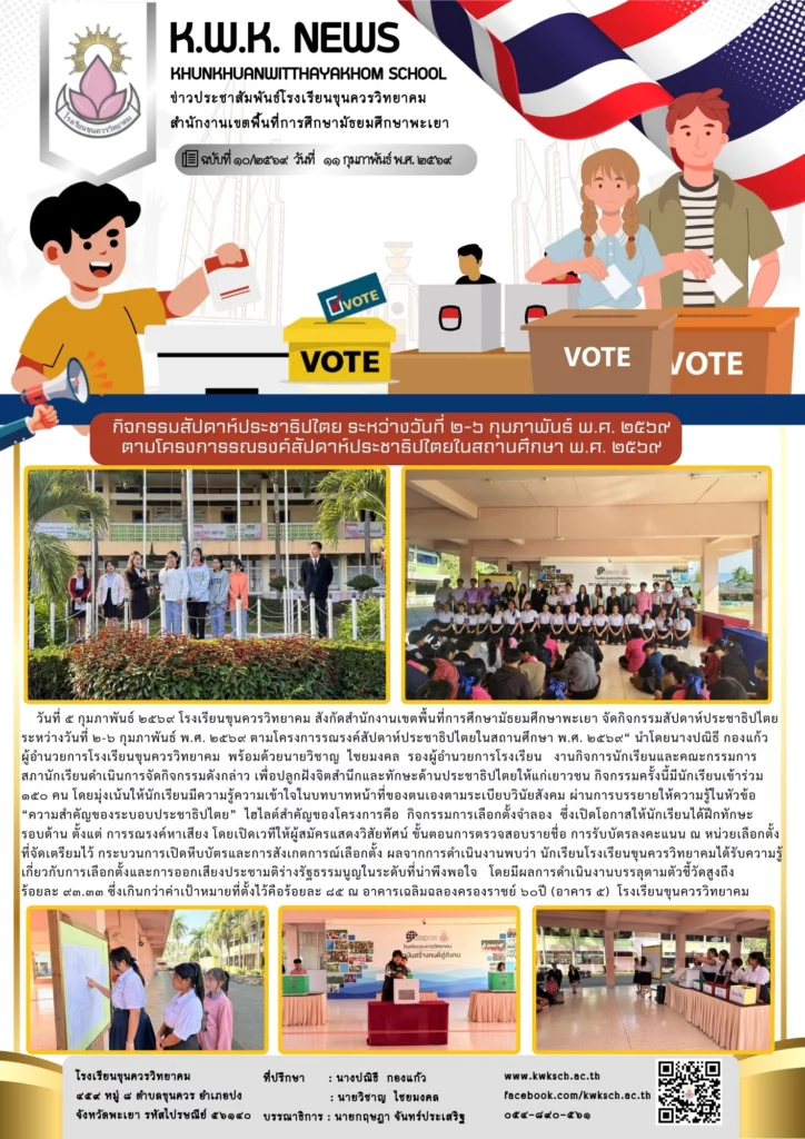 วันที่ ๕ กุมภาพันธ์ ๒๕๖๙ โรงเรียนขุนควรวิทยาคม สังกัดสำนักงานเขตพื้นที่การศึกษามัธยมศึกษาพะเยา จัดกิจกรรมสัปดาห์ประชาธิปไตย ระหว่างวันที่ ๒-๖ กุมภาพันธ์ พ.ศ. ๒๕๖๙ ตามโครงการรณรงค์สัปดาห์ประชาธิปไตยในสถานศึกษา พ.ศ. ๒๕๖๙“ นำโดยนางปณิธี กองแก้ว ผู้อำนวยการโรงเรียนขุนควรวิทยาคม พร้อมด้วยนายวิชาญ ไชยมงคล รองผู้อำนวยการโรงเรียน งานกิจการนักเรียนและคณะกรรมการ สภานักเรียนดำเนินการจัดกิจกรรมดังกล่าว เพื่อปลูกฝังจิตสำนึกและทักษะด้านประชาธิปไตยให้แก่เยาวชน กิจกรรมครั้งนี้มีนักเรียนเข้าร่วม ๑๕๐ คน โดยมุ่งเน้นให้นักเรียนมีความรู้ความเข้าใจในบทบาทหน้าที่ของตนเองตามระเบียบวินัยสังคม ผ่านการบรรยายให้ความรู้ในหัวข้อ “ความสำคัญของระบอบประชาธิปไตย” ไฮไลต์สำคัญของโครงการคือ กิจกรรมการเลือกตั้งจำลอง ซึ่งเปิดโอกาสให้นักเรียนได้ฝึกทักษะ รอบด้าน ตั้งแต่ การรณรงค์หาเสียง โดยเปิดเวทีให้ผู้สมัครแสดงวิสัยทัศน์ ขั้นตอนการตรวจสอบรายชื่อ การรับบัตรลงคะแนน ณ หน่วยเลือกตั้งที่จัดเตรียมไว้ กระบวนการเปิดหีบบัตรและการสังเกตการณ์เลือกตั้ง ผลจากการดำเนินงานพบว่า นักเรียนโรงเรียนขุนควรวิทยาคมได้รับความรู้เกี่ยวกับการเลือกตั้งและการออกเสียงประชามติร่างรัฐธรรมนูญในระดับที่น่าพึงพอใจ โดยมีผลการดำเนินงานบรรลุตามตัวชี้วัดสูงถึง ร้อยละ ๙๓.๓๓ ซึ่งเกินกว่าค่าเป้าหมายที่ตั้งไว้คือร้อยละ ๘๕ ณ อาคารเฉลิมฉลองครองราชย์ ๖๐ปี (อาคาร ๕) โรงเรียนขุนควรวิทยาคม