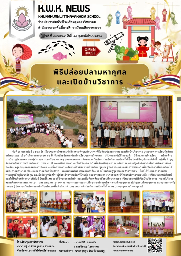 วันที่ ๙ กุมภาพันธ์ ๒๕๖๙ โรงเรียนขุนควรวิทยาคมจัดกิจกรรมทำบุญตักบาตร พิธีปล่อยปลามหากุศลและเปิดบ้านวิชาการ บูรณาการการเรียนรู้สู่สังคมแห่งความสุข เนื่องในโอกาสครบรอบ ๓๖ ปี วันคล้ายวันสถาปนาโรงเรียนขุนควรวิทยาคม นำโดยนางปณิธี กองแก้ว ผู้อำนวยการโรงเรียน พร้อมด้วยนายวิชาญไชยมงคล รองผู้อำนวยการโรงเรียน คณะครู บุคลากรทางการศึกษาและนักเรียน ร่วมจัดกิจกรรมในครั้งนี้ขึ้น โดยมีวัตถุประสงค์ดังนี้ ๑)เพื่อทำบุญวันคล้ายวันสถาปนาโรงเรียนครบรอบ ๓๖ ปี และเสริมสร้างความเป็นสิริมงคล ๒) เพื่อส่งเสริมคุณธรรม จริยธรรม และปลูกฝังจิตสำนึกในการทำความดีแก่นักเรียน ครูและบุคลากรทางการศึกษา ๓) เพื่อสร้างความสัมพันธ์อันดีระหว่างโรงเรียน ชุมชน ผู้ปกครอง และภาคีเครือข่าย ๔) เพื่อเปิดโอกาสให้นักเรียนได้แสดงความสามารถ ทักษะและความคิดสร้างสรรค์ และเผยแพร่ผลงานทางการศึกษาของโรงเรียนสู่ชุมชนและสาธารณชน โดยได้รับเมตตาจากท่านพระครูปลัดสุวัฒนจริยคุณ ดร.(โยธิน ฐานิสฺสโร) ผู้ช่วยเจ้าอาวาสวัดศรีโคมคำ พระอารามหลวง ประธานสงฆ์วัดธรรมมิการาม(สบเกี๋ยง) เป็นประธานพิธีสงฆ์ และได้รับเกียรติจากนายนิพันธ์ จันทร์กิเสน รองผู้อำนวยการสำนักงานเขตพื้นที่การศึกษามัธยมศึกษาพะเยา เป็นประธานพิธีเปิดบ้านวิชาการ คณะผู้บริหารสถานศึกษาจาก สพม.พะเยา และ สพป.พะเยา เขต ๒ คณะกรรมการสถานศึกษา องค์การบริหารส่วนตำบลขุนควร ผู้นำชุมชนตำบลขุนควร หน่วยงานภาครัฐ เอกชน ผู้ปกครองนักเรียนและนักเรียนในเขตพื้นที่บริการตำบลขุนควร เข้าร่วมกิจกรรมในครั้งนี้ ณ หอประชุมขุนควรวิทยานุสรณ์