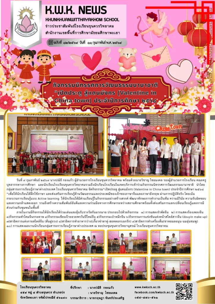 วันที่ ๙ กุมภาพันธ์ ๒๕๖๙ นางปณิธี กองแก้ว ผู้อำนวยการโรงเรียนขุนควรวิทยาคม พร้อมด้วยนายวิชาญ ไชยมงคล รองผู้อำนวยการโรงเรียน คณะครูบุคลากรทางการศึกษา และนักเรียนโรงเรียนขุนควรวิทยาคมรวมถึงนักเรียนโรงเรียนในเขตบริการเข้าร่วมกิจกรรมนิทรรศการวัฒนธรรมนานาชาติ นำโดยกลุ่มสาระการเรียนรู้ภาษาต่างประเทศ โรงเรียนขุนควรวิทยาคม จัดกิจกรรม“เปิดประตู สู่แดนมังกร (Valentine in China town) ประจำปีการศึกษา ๒๕๖๘ “เพื่อให้นักเรียนได้ฝึกใช้ภาษา และส่งเสริมการเรียนรู้ด้านวัฒนธรรมและประเพณีของเจ้าของภาษาจีนและภาษาอังกฤษ ผ่านการปฏิบัติจริง โดยเน้นกระบวนการเรียนรู้แบบ Active learning ให้นักเรียนได้มีส่วนเรียนรู้ในกิจกรรมอย่างสร้างสรรค์ พัฒนาทักษะการทำงานเป็นทีม ความมีวินัย ความรับผิดชอบ และความกล้าแสดงออก รวมถึงสร้างความสัมพันธ์อันดีและความร่วมมือทางการศึกษาระหว่างสถานศึกษาพร้อมทั้งส่งเสริมการแลกเปลี่ยนเรียนรู้และการมี ส่วนร่วมกับชุมชนในพื้นที่