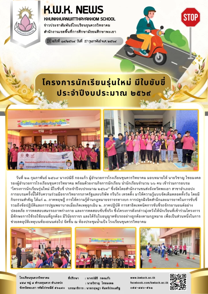 วันที่ ๒๑ กุมภาพันธ์ ๒๕๖๙ นางปณิธี กองแก้ว ผู้อำนวยการโรงเรียนขุนควรวิทยาคม มอบหมายให้ นายวิชาญ ไชยมงคล รองผู้อำนวยการโรงเรียนขุนควรวิทยาคม พร้อมด้วยงานกิจการนักเรียน นำนักเรียนจำนวน ๖๖ คน เข้าร่วมการอบรม “โครงการนักเรียนรุ่นใหม่ มีใบขับขี่ ประจำปีงบประมาณ ๒๕๖๙” ซึ่งจัดโดยสำนักงานขนส่งจังหวัดพะเยา สาขาอำเภอปง การอบรมครั้งนี้ได้รับความร่วมมือจากวิทยากรภาครัฐและบริษัท กรีนวิง เทรดดิ้ง มาให้ความรู้แบบจัดเต็มตลอดทั้งวัน โดยมีกิจกรรมสำคัญ ได้แก่