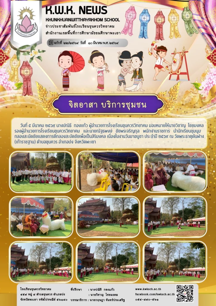 วันที่ ๕ มีนาคม ๒๕๖๙ นางปณิธี กองแก้ว ผู้อำนวยการโรงเรียนขุนควรวิทยาคม มอบหมายให้นายวิชาญ ไชยมงคล รองผู้อำนวยการโรงเรียนขุนควรวิทยาคม และนายณัฐธพงษ์ ชัยพรเจริญกุล พนักงานราชการ นำนักเรียนชุมนุมกลองสะบัดชัยแสดงการตีกลองสะบัดชัยเพื่อเป็นสิริมงคล เนื่องในงานวันมาฆบูชา ประจำปี ๒๕๖๙ ณ วัดพระธาตุต้นฝาง (เก๊าราชฐาน) ตำบลขุนควร อำเภอปง จังหวัดพะเยา