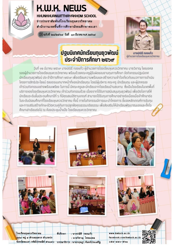 วันที่ ๑๒ มีนาคม ๒๕๖๙ นางปณิธี กองแก้ว ผู้อำนวยการโรงเรียนขุนควรวิทยาคม นายวิชาญ ไชยมงคล รองผู้อำนวยการโรงเรียนขุนควรวิทยาคม พร้อมด้วยคณะครูผู้รับผิดชอบงานทุนการศึกษา จัดกิจกรรมปฐมนิเทศนักเรียนทุนยุวพัฒน์ ประจำปีการศึกษา ๒๕๖๙ เพื่อเตรียมความพร้อมและสร้างความเข้าใจเกี่ยวกับแนวทางการดำเนินโครงการสิทธิประโยชน์ ตลอดจนบทบาทหน้าที่ของนักเรียนทุน โดยมีผู้บริหาร คณะครู นักเรียนทุน และผู้ปกครองเข้าร่วมกิจกรรมอย่างพร้อมเพรียง ในการนี้ มีคณะครูและนักเรียนจากโรงเรียนบ้านสบขาม ซึ่งเป็นโรงเรียนในเขตพื้นที่บริการของโรงเรียนขุนควรวิทยาคม เข้าร่วมกิจกรรมด้วย เนื่องจากได้รับการสนับสนุนทุนยุวพัฒน์ เพื่อเปิดโอกาสให้นักเรียนระดับชั้นประถมศึกษาปีที่ ๖ ที่มีคุณสมบัติตามเกณฑ์ สามารถได้รับทุนการศึกษาอย่างต่อเนื่องเมื่อเข้าศึกษาต่อในระดับมัธยมศึกษาที่โรงเรียนขุนควรวิทยาคม ทั้งนี้ ภายในกิจกรรมมีการแนะนำโครงการ ชี้แจงหลักเกณฑ์การรับทุน และการเสริมสร้างทักษะชีวิตควบคู่กับการปลูกฝังคุณธรรมจริยธรรม เพื่อส่งเสริมให้นักเรียนพัฒนาตนเองและตั้งใจศึกษาเล่าเรียนต่อไป ณ ห้องประชุมน้ำแป้ง โรงเรียนขุนควรวิทยาคม