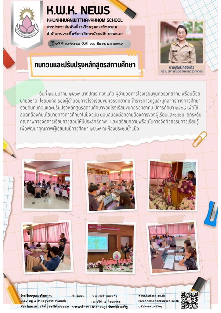 วันที่ ๒๕ มีนาคม ๒๕๖๙ นางปณิธี กองแก้ว ผู้อำนวยการโรงเรียนขุนควรวิทยาคม พร้อมด้วยนายวิชาญ ไชยมงคล รองผู้อำนวยการโรงเรียนขุนควรวิทยาคม ข้าราชการครูและบุคลากรทางการศึกษา ร่วมกันทบทวนและปรับปรุงหลักสูตรสถานศึกษาของโรงเรียนขุนควรวิทยาคม ปีการศึกษา ๒๕๖๘ เพื่อให้สอดคล้องกับนโยบายทางการศึกษาในปัจจุบัน ตอบสนองต่อความต้องการของผู้เรียนและชุมชน ยกระดับคุณภาพการจัดการเรียนการสอนให้มีประสิทธิภาพ และเตรียมความพร้อมในการจัดกิจกรรมการเรียนรู้เพื่อพัฒนาคุณภาพผู้เรียนในปีการศึกษา ๒๕๖๙ ณ ห้องประชุมน้ำแป้ง